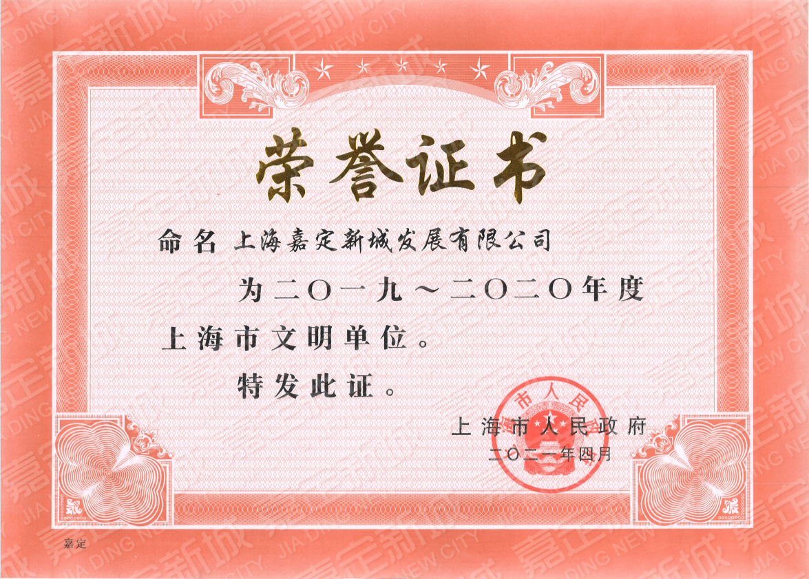 近日(ri),新(xin)城(cheng)公(gōng)司被上海市(shi)人(ren)民(mín)政府授(shou)予了(le)"2019--2020年(nian)度上海市(shi)文(wén)明單(dan)位"榮譽證書